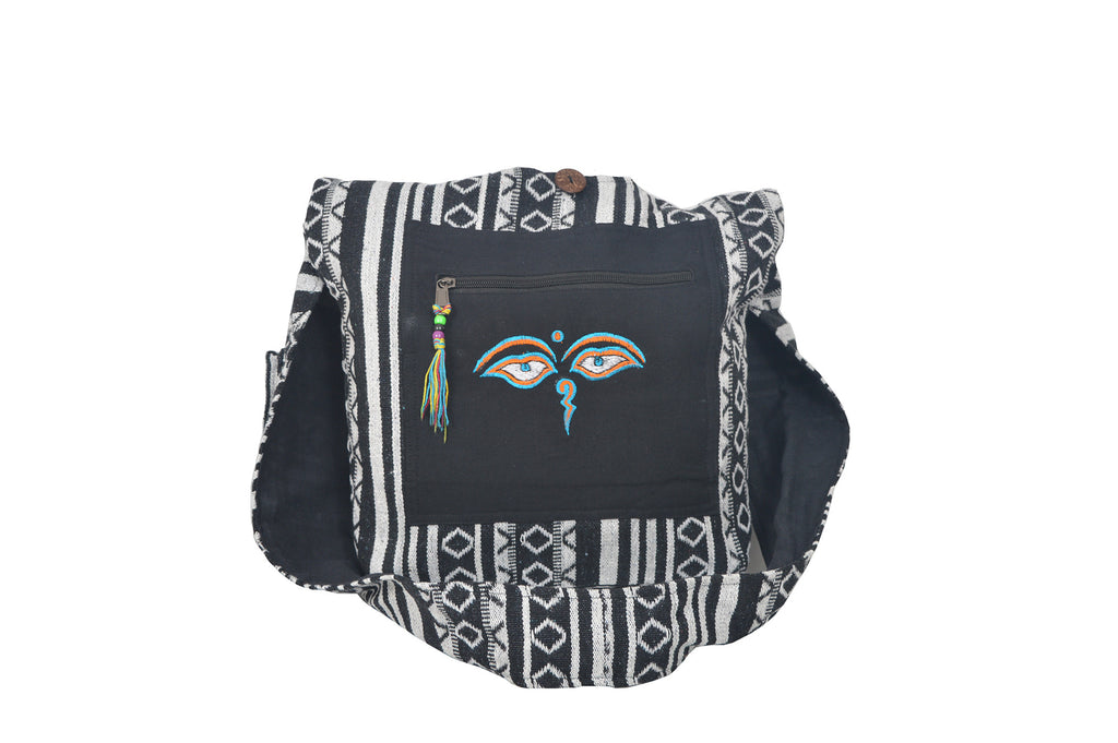 Gherri shoulder bag with Buddha eye embroidery at front zip and button closure hand stitched in Nepal, great for everyday use. An excellent choice for casual outings, school, shopping, or travel. The interior has enough space to hold all of your daily necessities. Because this item is handmade, there may be some slight variations in size and color.