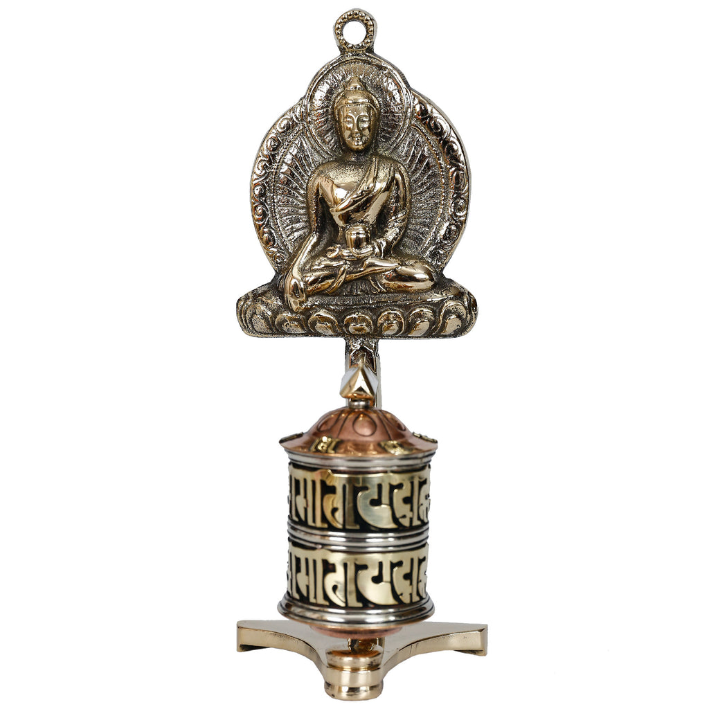 Product DescriptionsTibetan Buddhist prayer wheel, made up of brass and copper with Buddha design frame. You can either place on table top or mount it on the wall. The "om mani padme hum" mantra is written in Sanskrit writing around the outside of this prayer wheel. Sacred Buddhist mantras are written on a long roll of paper kept inside this wheel. This roll of mantras rotates with each rotation of this wheel. With every rotation of wheel, these mantras are believed to be recited once. There are slight variations to design on each.