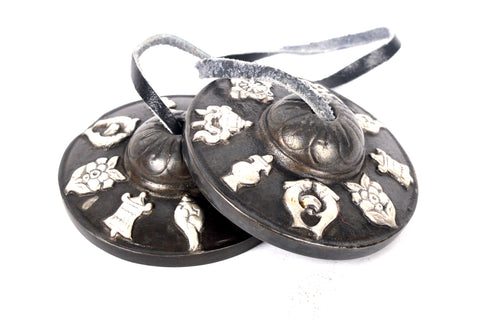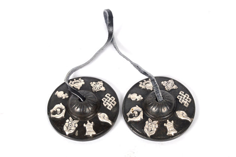Tibetan Buddhist Hand Bells Tingsha cymbals with embossed .Tibetan Tingsha Bells is special used for Space Clearing, personal energy clearing, meditation, and healing work.Tibetan Buddhist Hand Bells Tingsha cymbals with embossed .Tibetan Tingsha Bells is special used for Space Clearing, personal energy clearing, meditation, and healing work.Tibetan Tingshas are small Prayer Chimes used by Tibetan Buddhist Monks, Yoga Teachers, Holistic Health Practitioners, and Meditation Groups. They are traditionally used for ceremonial functions throughout the Himalayan regions of Nepal, Tibet, India and, Bhutan They are often used to start and end a Meditation, Yoga Class, or simply for Space Clearing to remove negative energy around you. They come in matched pair, held together by a leather cord. It can be played by tapping the rims together or by clapping them together like cymbals. They are made of a special alloy with the thickness and shape being important elements in creating the beautiful overtones. Tingshas have varying emblems and symbols embossed on the outside. This pair is embossed with the mantra.