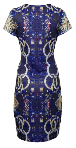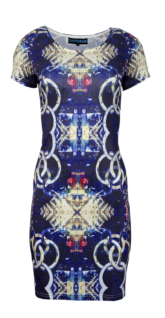 Women's short sleeved dress with multicolored pattern print