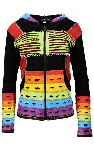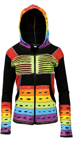 Women's Full Sleeved Multicolored Unique Patched Jacket.Tattopani Women's Cardigan with and attach hood. Stone Wash and Made of Cotton . Hand made Embroidery Unique and different in style.