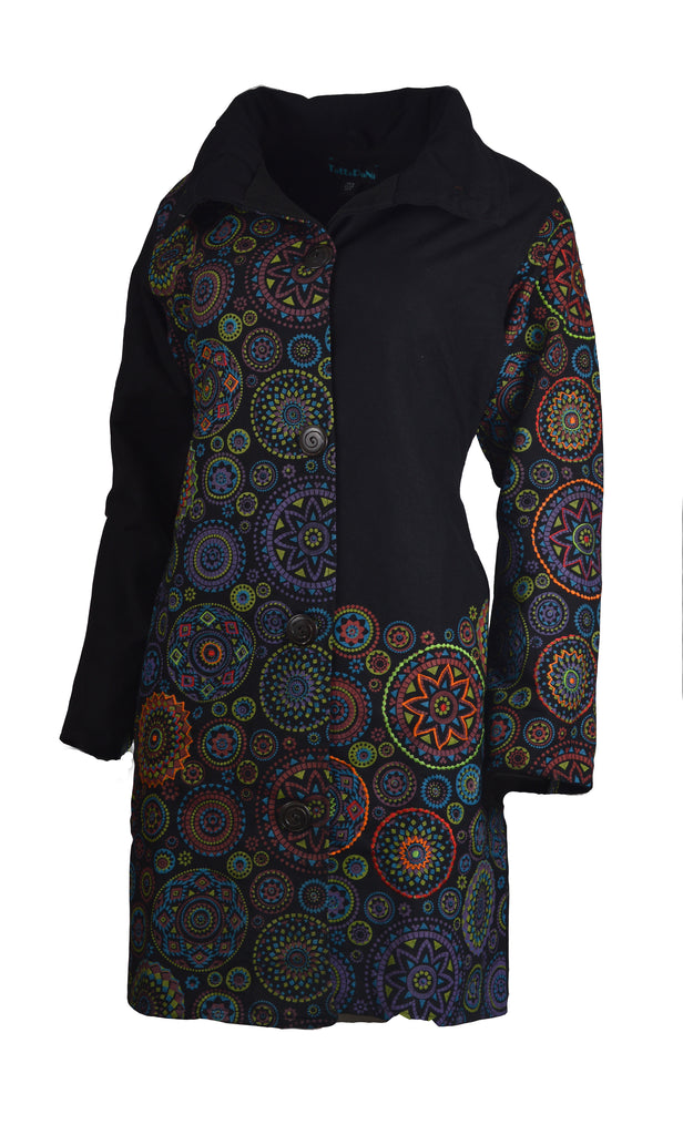 Women's long sleeve cotton jacket all over mandala print ladies trench coat . 100% cotton fabric. Inner-lining viscose to keep you warm. Hand embroidery design.